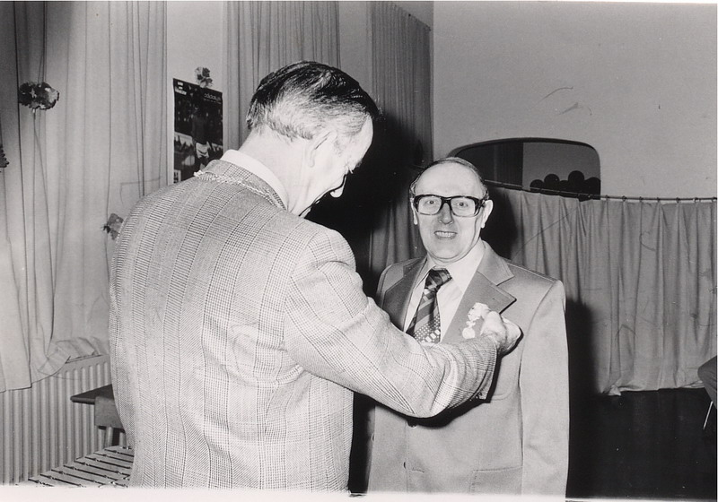 De heer Bot, conciërge aan de Vakschool voor Meisjes ontvangt een onderscheiding uit handen van Burg. Hendriks.