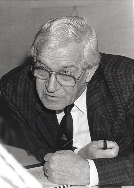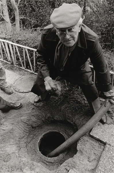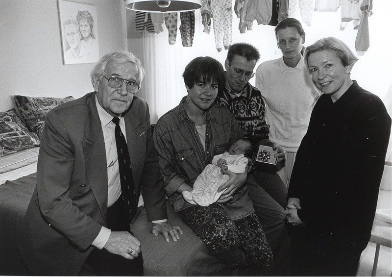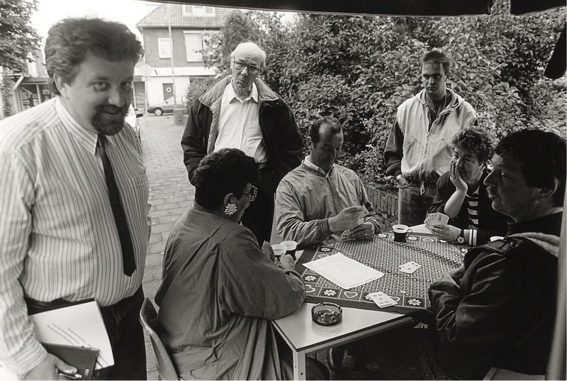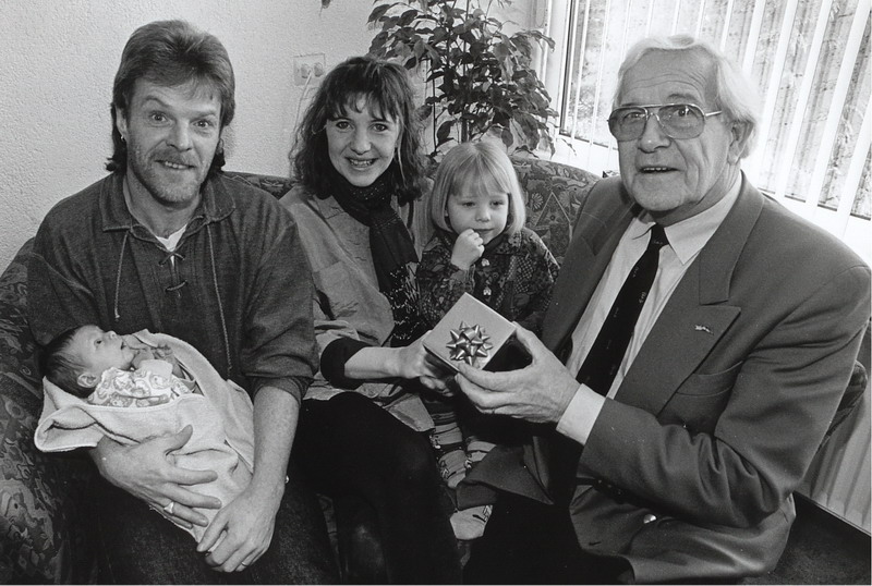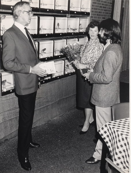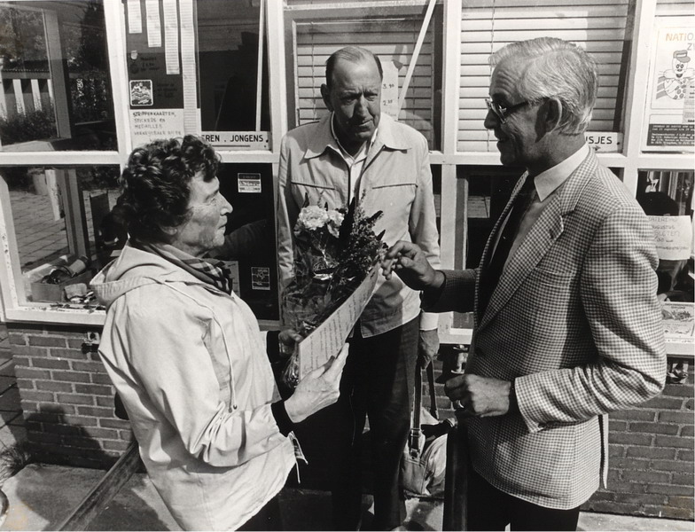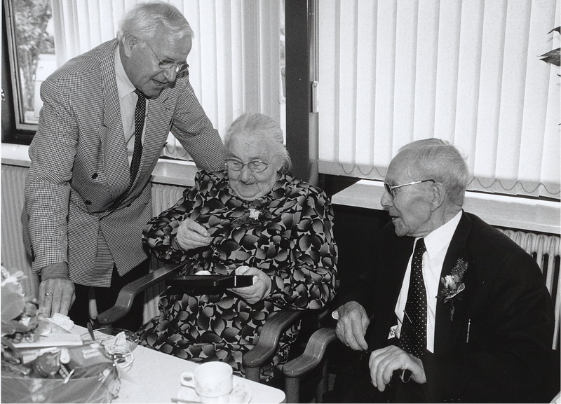 Bas Korporaal op bezoek bij het echtpaar L.W. van der Sluys. Ik vermoed bij het 60 (70?) jarig huwelijksfeest. Van der Sluys is ouderling geweest in de Christelijke Gereformeerde Beth-El kerk te Sliedrecht (1979-1989).