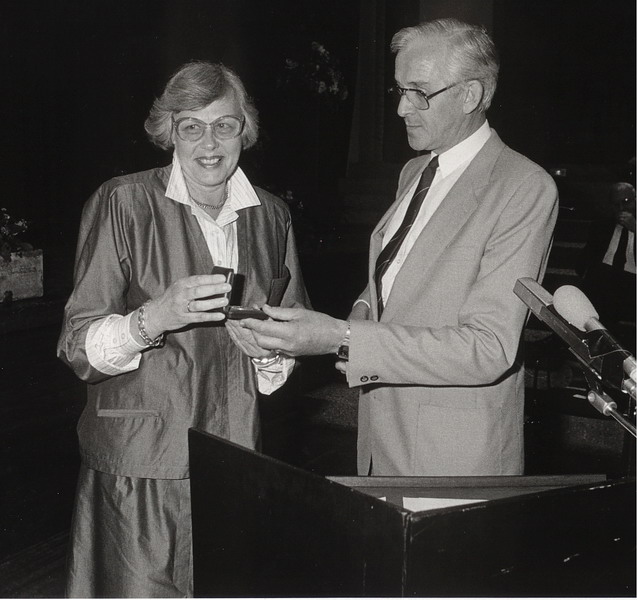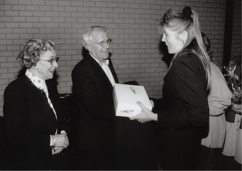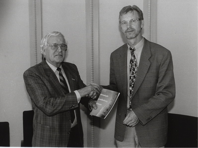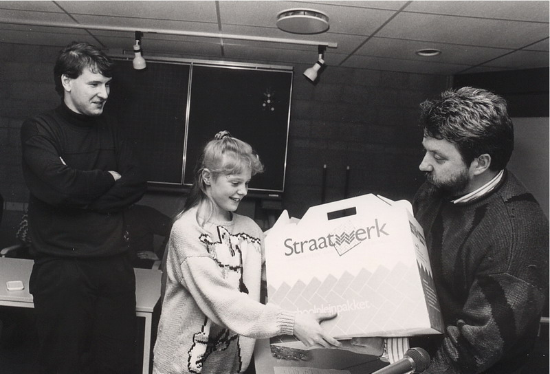 Wethouder Gerrit Venis overhandigt op het politiebureau aan een leerlinge van de Jan Ligthartschool een leerpakket t.b.v. het verkeersonderwijs. Onderwijzer Rook Kamsteeg kijkt toe. 1989.