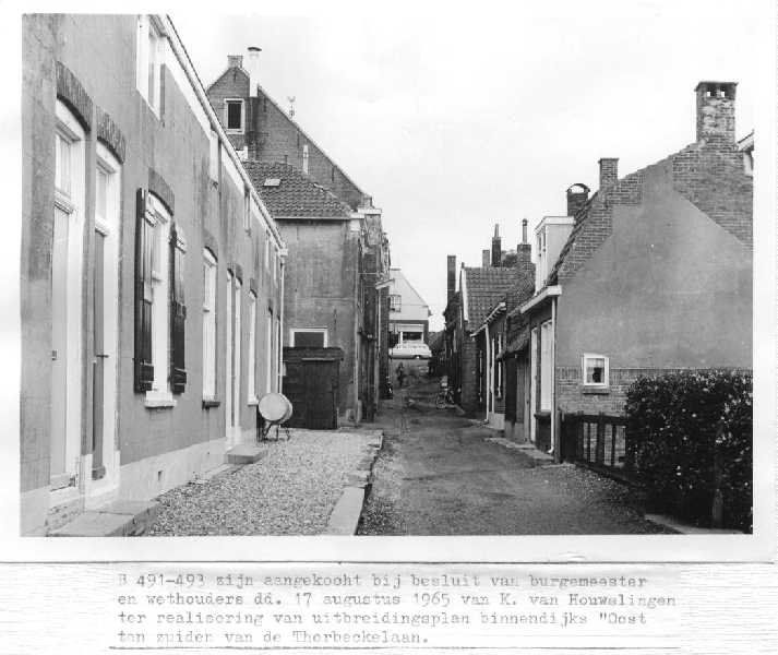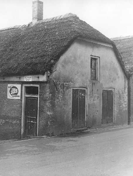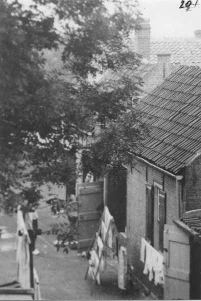 Droogstelling. Het betreft de Baanstoep. De eerste huisjes achter de thans nog bestaande schuur. Was genummerd B 549 en B 551