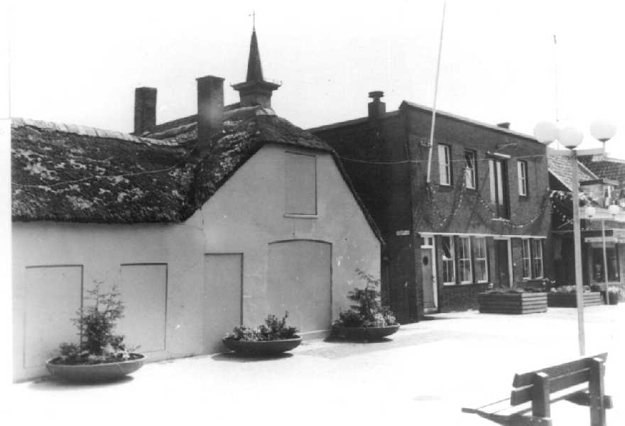 De foto vertoont de zijkant van de banketfabriek de Merba. Het was een voormalige geref. kerk. Verder de achterzijde van de banketbakkerij van Jorien Baas.. Oprit P.C. Hooftlaan.
