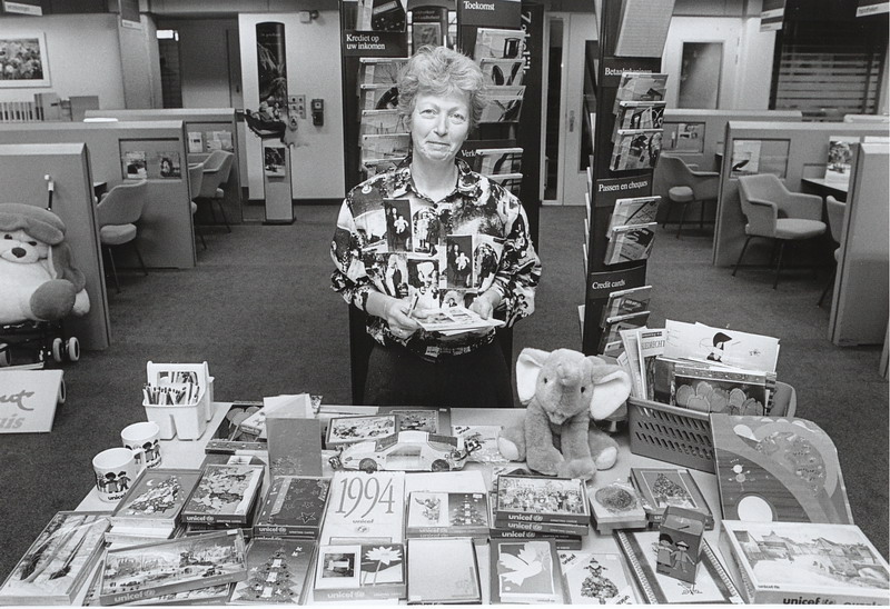 Verkoping voor Unicef in de AMRO-bank aan de Stationsweg.