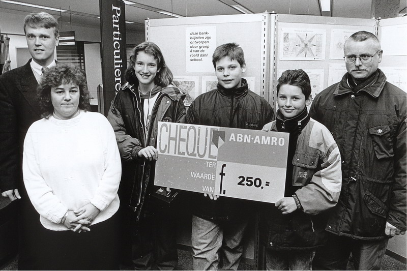 Leerlingen van meester Gerard de Jonge ontvangen een cheque van de ABN-AMRObank