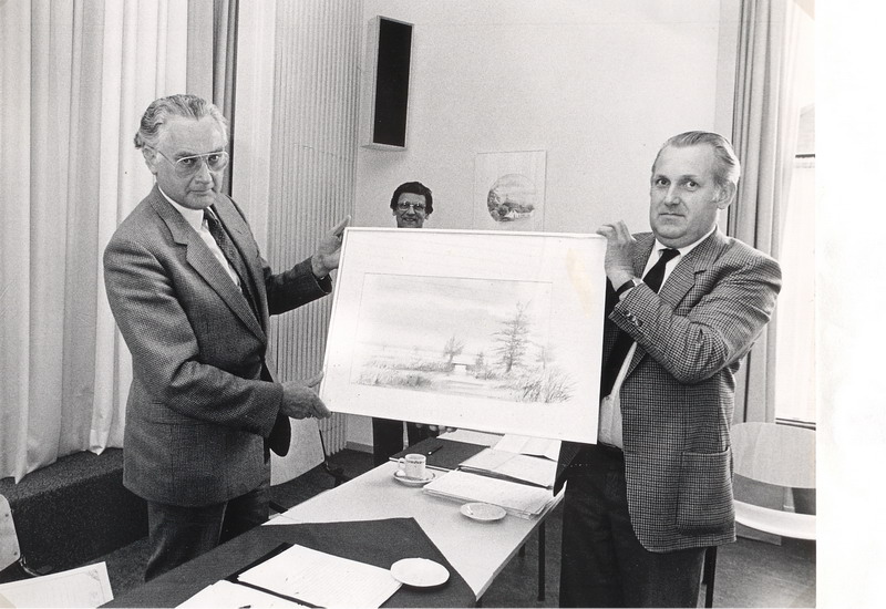Cadeau voor de RABO-bank wordt in ontvangst genomen door directeur Arie in 't Veld.