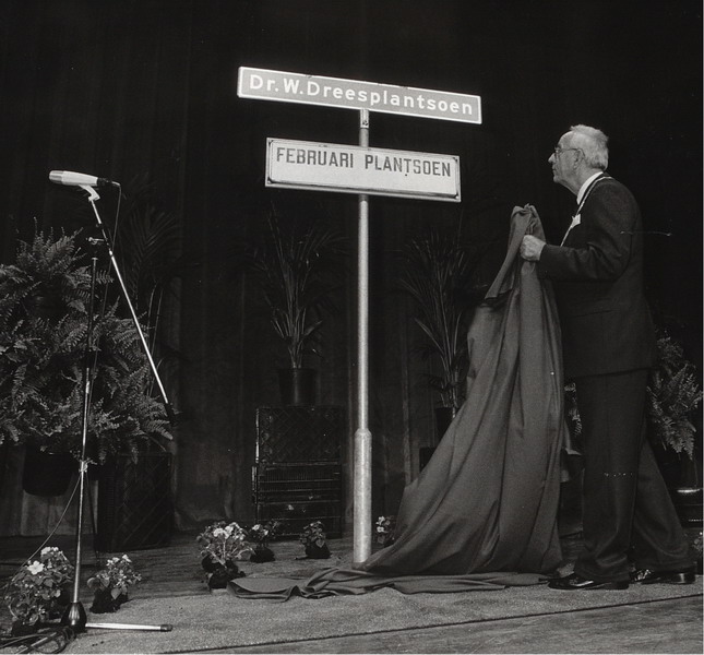 Burgemeester Hendriks onthult het Dressplantsoen. Later weer teruggedraaid tot Februariplantsoen.