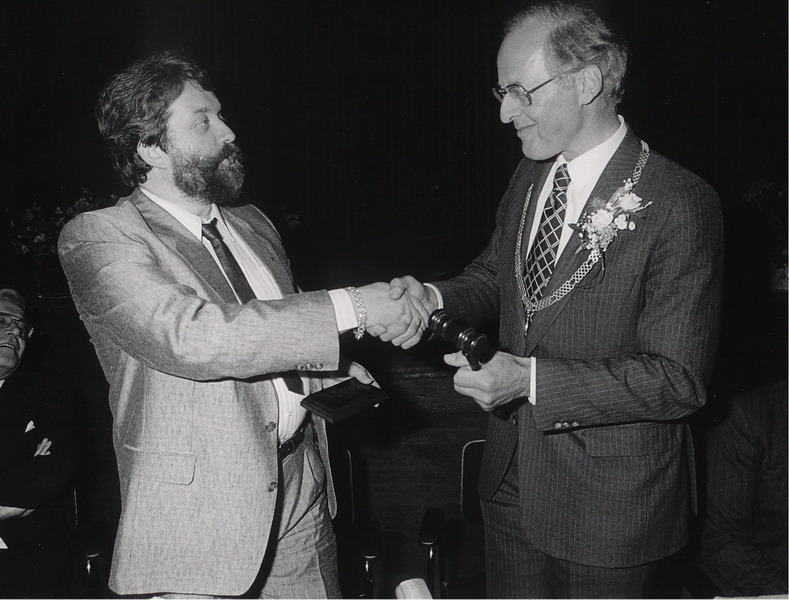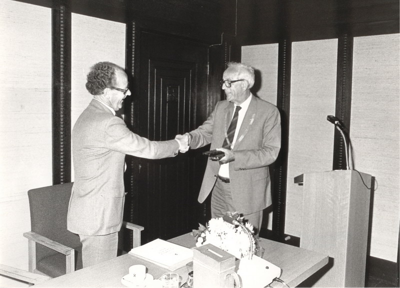 Burgemeester Hendriks schudt gemeentesecretaris Leen Kniep de hand.