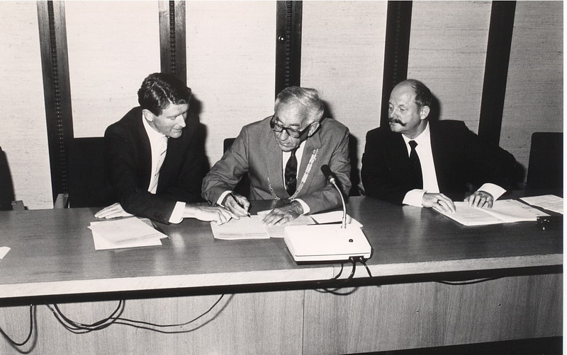 Burgemeester Spijkerboer wordt begroet door de wethouders Harinck en Korporaal