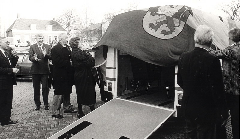 Burgemeester Hendriks en echtgenote onthullen rolstoelbus.