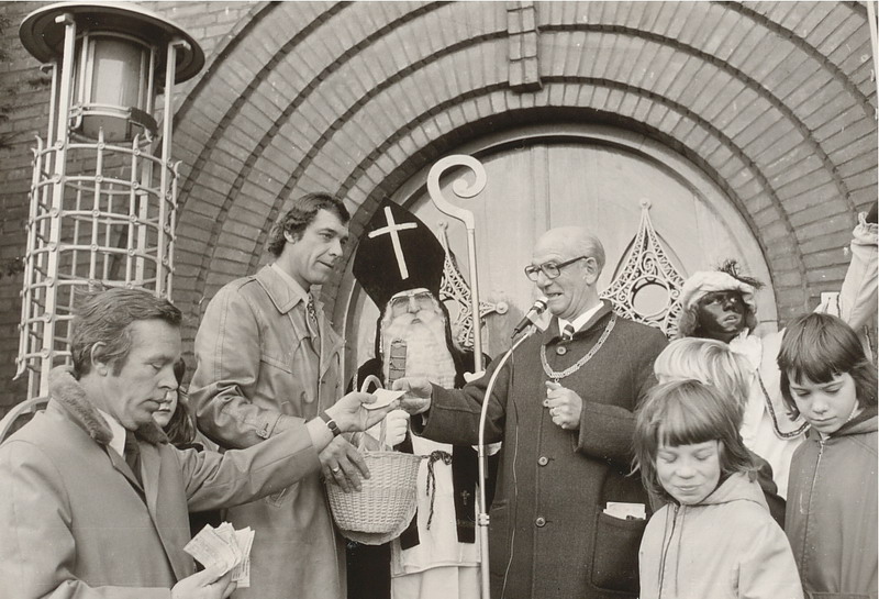 Burgemeester Chris van Hofwegen met Sinterklaas op de stoep van het gemeentehuis