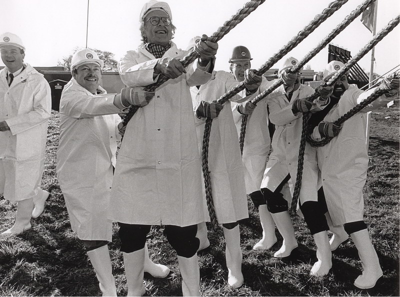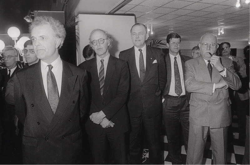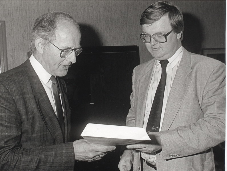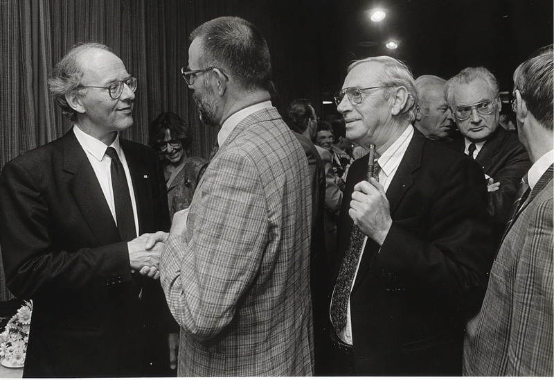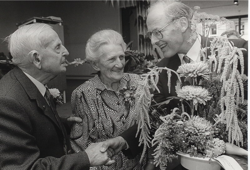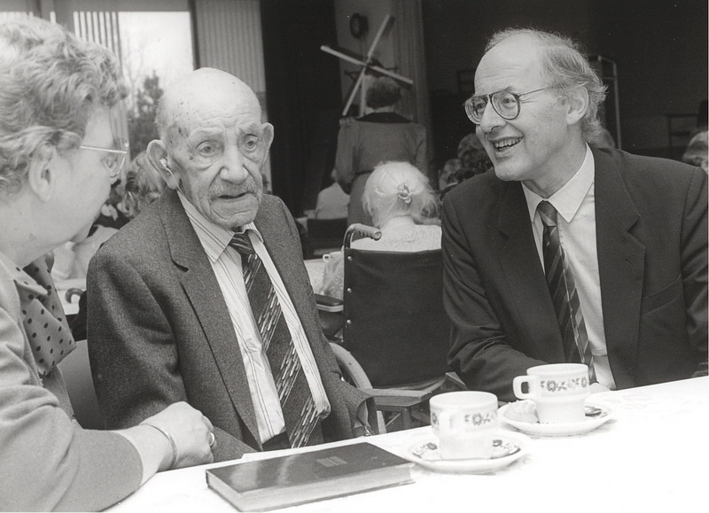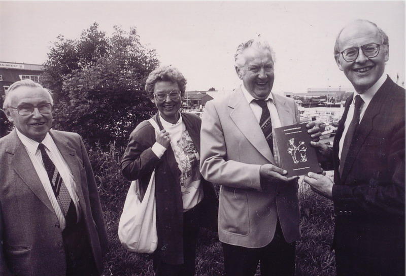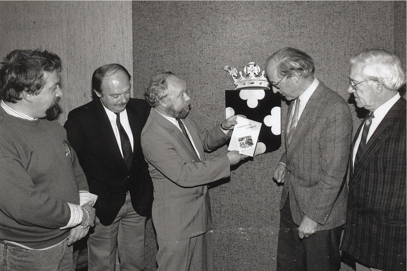 Burgemeester Spijkerboer neemt in 1990 het boek Baggerdurpspraot in ontvangst van Teun Schram, Korrie Lissenburg en Rook Buizert.